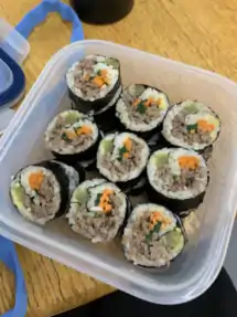 Gimbap (김밥) is a Korean dish made from cooked rice and other ingredients that are rolled in gim—dried sheets of seaweed—and served in bite-sized slices.[1] It is not to be confused with sushi, which is from Japan. The dish is often part of a packed meal, or dosirak, to be eaten at picnics and outdoor events, and can serve as a light lunch along with danmuji (yellow pickled radish) and kimchi. It is a popular take-out food in South Korea and abroad,[2] and is known as a convenient food because of its portability.