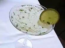 The gimlet (pronounced with a hard 'g') is a cocktail made of gin and lime juice. A 1928 description of the drink was: gin, and a spot of lime.[1] The description in the 1953 Raymond Chandler novel The Long Goodbye stated that "a real gimlet is half gin and half Rose's lime juice cordial and nothing else."[2] This is in line with the proportions suggested by The Savoy Cocktail Book (1930), which specifies one half Plymouth Gin and one half Rose's Lime Juice Cordial.[3] However, modern tastes are less sweet, and generally provide for at least two parts gin to one part of the lime and other non-alcoholic elements (see recipes below).