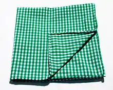 The name may originate from Malay genggang 'ajar, separate'.[3][4] Alternatively, it is speculated that the fabric now known as gingham may have been made at Guingamp, a town in Brittany, France, and that the fabric may be named after the town.[5] Some sources say that the name came into English via Dutch.[6][7] When originally imported into Europe in the 17th century, gingham was a striped fabric, though now it is distinguished by its checkered pattern. From the mid-18th century, when it was being produced in the mills of Manchester, England, it started to be woven into checked or plaid patterns (often blue and white). Checked gingham became more common over time, though striped gingham was still available in the late Victorian period.[8] The equivalent in the French language is the noun vichy, from the town of Vichy in France. Same word is used in Spain where this pattern is called "cuadro vichy" or "estampado vichy".
