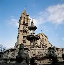 In 1547 he left Florence, and went to Messina where he procured a commission for the Fountain of Orion, the mythical founder of that city. When erected, the Orion Fountain was the tallest and largest of its day and was much admired by Vasari. It is a candelabrum type, like the fountains at the Medici villa at Castello by Tribolo, but it has evolved. The receiving basin is polygonal, contrasting with the circular basins above. The sculpted creatures supporting the second basin are carved in deep relief, but the female nudes above them appear to be carved in the round. They have become sculptures in their own right, and are not just there to decorate the shaft, or to draw the eye upwards to the figure at the summit. This is the candelabrum type at its pinnacle. On polygonal basin's rim are the statues of four river gods (Tiber, Nile, Camaro and Ebro) with Latin inscriptions by the scientist-humanist Francesco Maurolico who, probably, was also the creator of most of the Neoplatonic-alchemical program for the fountain.[4] On the perimeter are eight oval reliefs, all with subjects taken from Ovid's Metamorphoses.[5] In 1553 this fountain was finished, and he was commissioned for another fountain - the Fountain of Neptune.