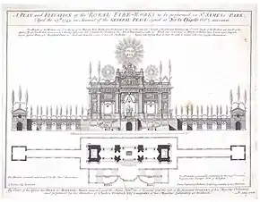 During the years 1738–1743 and 1754–1758, Servandoni produced a series of successful theatrical productions much in the style of seventeenth-century machine plays, with an emphasis on elaborate changes in décor and special effects, often set to music.[3] Unlike the machine plays of the seventeenth century, Servandoni's productions used pantomime rather than dialog, with a description of the story provided in the program. His productions were typically based on well-known stories from literature and mythology such as the "Spectacle de Pandore" (1739) which told the tale of Prometheus and Pandora or "La forêt enchantée" (1754) which was inspired by Torquato Tasso's "Jerusalem Delivered". He died in Paris in the early 1766.