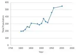 In 1831, occupations were grouped by social status. This included: 9 employers and professionals, 9 middling sorts, and 43 labourers and servants.[23] The 1831 national census simplified industry into four occupational categories which included: agriculture, manufacturing, retail and handicraft, and other. 52 worked in agriculture, 0 worked in manufacturing, 6 worked in retail and handicraft, and 3 worked in 'other'.[24] The 'other' category included 2 capitalists and professionals, and 1 servant.[25]