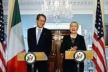 During his tenure, he held 1,483 meetings and events, which covered 91 different countries with 75 official visits abroad and 138 meetings with other foreign ministers, of which 63 in Italy and 75 overseas.[2] He was member of the "Westervelle Group", composed by 11 European Foreign Ministers and aimed at supporting initiatives for "More Europe" in the European political integration process.[3] He actively promoted UN moratorium on the death penalty resolution and other campaigns for human rights and fundamental freedoms.[4] Within the EU and NATO, Minister Terzi was a strong advocate for a renewed "Pratica di Mare" partnership with the Russian Federation in order to settle energy and rule of law issues, as well as European security concerns raising from east–west diverging positions on conventional and nuclear forces. He gave impulse to policies of diversification of energy supplies to Italy, by negotiating and signing during the 2012 UNGA in New York the Memorandum of Understanding (MoU) for the Trans Adriatic Pipeline (TAP) between Albania, Greece and Italy, by strengthening relations with transitional governments in Libya, and enhancing economic cooperation with Mozambique, Angola and Algeria. He pursued a reinforced Mediterranean political and economic cooperation in the Mediterranean region in the "5+5 Dialogue" framework, with Spain, France, Italy, Malta, Portugal, Libya, Morocco, Mauritania and Tunisia, and other bilateral and multilateral initiatives through the EU, NATO and the UN. At the same time Minister Terzi did strive for a closer EU political, economic, and scientific cooperation with Israel and for the reactivation of the peace process on the basis of the two-state solution. During his tenure, Minister Terzi engaged in a more active Italian diplomacy for the Horn of Africa, by visiting and signing new agreements with Ethiopia and Somalia.[5]