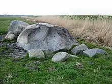 Such erratics on Rügen, which are made of crystalline and metamorphic rock, that have a minimum volume of 10 m³ belong to the legally protected geotopes on the island.[1] For most erratics, however the volume cannot be exactly worked out, because they are normally partly embedded in the ground. The sizes given in the list are based on estimates by the majority of geologists given in their publications. In addition the list shows the estimated above-ground volumes; the below-ground element is not recorded. The approximation factor of 0.6 is based on experience and accounts for the usual difference in volume from a rectangular block.