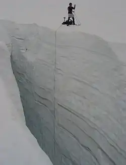 To determine mass balance in the accumulation zone, snowpack depth is measured using probing, snowpits or crevasse stratigraphy. Crevasse stratigraphy makes use of annual layers revealed on the wall of a crevasse.[13] Akin to tree rings, these layers are due to summer dust deposition and other seasonal effects. The advantage of crevasse stratigraphy is that it provides a two-dimensional measurement of the snowpack layer, not a point measurement. It is also usable in depths where probing or snowpits are not feasible. In temperate glaciers, the insertion resistance of a probe increases abruptly when its tip reaches ice that was formed the previous year. The probe depth is a measure of the net accumulation above that layer. Snowpits dug through the past winters residual snowpack are used to determine the snowpack depth and density. The snowpack's mass balance is the product of density and depth. Regardless of depth measurement technique the observed depth is multiplied by the snowpack density to determine the accumulation in water equivalent. It is necessary to measure the density in the spring as snowpack density varies. Measurement of snowpack density completed at the end of the ablation season yield consistent values for a particular area on temperate alpine glaciers and need not be measured every year. In the ablation zone, ablation measurements are made using stakes inserted vertically into the glacier either at the end of the previous melt season or the beginning of the current one. The length of stake exposed by melting ice is measured at the end of the melt (ablation) season. Most stakes must be replaced each year or even midway through the summer.