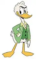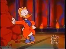 Gladstone makes two speaking appearances in the animated series DuckTales, where he was voiced by Rob Paulsen. In these episodes he is not characterized as much of a braggart he is in the comics but rather focusing much more on his care-free nature, and additionally acting a bit more foolishly. In the episode "Dime Enough for Luck", Gladstone is an unwitting stooge for Magica De Spell in one of her attempts to steal Scrooge's Number One Dime. He returns in the episode "Dr. Jekyll & Mr. McDuck", where he accidentally bids on an item that turns out to be valuable. This inspires Scrooge to bid on the next item—a trunk containing Dr. Jekyll's formula—which sets the plot in motion. He also makes non-speaking cameo appearances in the episodes "Sweet Duck of Youth" and "Till Nephews Do Us Part", as well in episode of House of Mouse titled "Goofy For A Day". Gladstone appears in the 2000 computer game Donald Duck: Goin' Quackers in his traditional role of Donald's rival for Daisy's affection, and every time a Boss Battle is about to start, Gladstone greets Donald, but always gets hurt, becoming squished by a giant bird, getting knocked off a building by a wrecking ball, being sent crashing to the bottom of a haunted mansion, and even gets sent back to Duckburg inside a pipe, and every time he gets hurt, he keeps saying that he's found a nickel. He also appears in the DuckTales reboot, first appearing in the episode "The House of the Lucky Gander!".[10] In this series, he is voiced by Paul F. Tompkins. This series brings his personality far closer to how he acts in the comics, although it is implied that he is genuinely unaware of how arrogant he is.