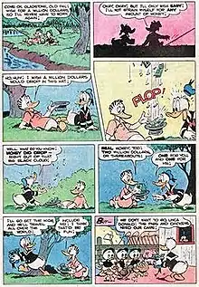 Gladstone Gander first appeared in "Wintertime Wager" in Walt Disney's Comics and Stories #88 (January, 1948), written and drawn by Carl Barks.[5] In that story he arrives at Donald Duck's house during a freezing cold Christmas Day to remind him of a wager Donald made the previous summer; that he could swim in the Frozenbear Lake during Christmas Day or forfeit his house to Gladstone. Donald eventually loses the wager but Gladstone later on loses a wager of his own, brought to light by Daisy Duck, and thus Donald's house is returned to him.