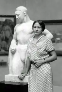 ![]() Bates standing next to her sculpture "The Acrobat," in 1934 | |