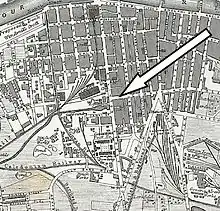 In 1827, a second bill passed parliament and gained Royal Assent on 14 June.[12] This bill allowed for the financing and construction of a railway from the Johnstone canal basin to Ardrossan. This railway was to have been 22 miles (35 km) and 3 furlongs long. Parliament dictated that due to the failure to complete the canal past Johnstone, that work on the railway should be started at the Ardrossan harbour end. The line did not progress past Kilwinning before running out of funds. The railway, owned and operated by the canal company, was built to the Scotch gauge of 4 feet 6 inches (1,370 mm). It used pairs of horses to pull carriages of up to 22 people each. The fares were initially 1 penny per mile but in 1837, due to the application of a government duty, the fare was raised to 8 pence per 6 miles (9.7 km). In the three years preceding September 1839, the railway transported an average of 30,000 people each year. Apart from passengers, the main freight was coal from Eglinton's mines.[13]