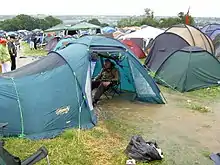 Campervans, caravans and trailer tents are not allowed into the main festival site. However, the purchase of a campervan ticket in addition to the main ticket allows access to fields just outside the boundary fence; and the cost includes access for the campervan or towing vehicle and the caravan; the car, or other vehicle used to tow the caravan, may be parked alongside it but sleeping is only authorised in the campervan/caravan and connected awning, not in the accompanying vehicle. One additional tent may accompany the caravan/campervan if space within the plot allows. Some people choose to bring or hire a motorhome, though drivers of larger vehicles or motorhomes may have to purchase a second campervan ticket if they cannot fit within the defined plot.[216][217] The 2009 festival saw changes to the campervan fields; commercial vehicles were no longer classed as 'campervans', all campervans had to have a fitted sleeping area and either washing or cooking facilities, and caravans and trailer tents were allowed back at the festival. Prior to this only campervans were allowed on site, caravans and trailers being banned in the early 1990s after a number were stuck in the mud and abandoned.[218]
