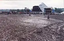 In 1985, the festival grew too large for Worthy Farm, but neighbouring Cockmill Farm was purchased.[29] That year saw a wet festival with considerable rain; Worthy Farm is a dairy farm and what washed down into the low areas was a mixture of mud and liquefied cow dung. This did not prevent festival-goers from enjoying the knee-deep slurry in front of the pyramid stage.