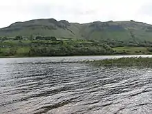 Glencar Lough lies in the Glencar Valley, between the Dartry Mountains to the north and the mountain range including Cope's Mountain to the south. The lake is located about 10 kilometres (6 mi) northeast of Sligo and about 15 km (9 mi) west of Manorhamilton. It is 2.5 km (1.6 mi) long from west to east and 0.6 km (0.4 mi) wide.[2] The lake has two crannogs (artificial islands): one at the western end near the Drumcliff River outlet and the other at the eastern end near the Diffreen River.[3]