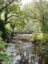 The valley of Glendalough was formed during the last ice age by a glacier which left a moraine across the valley mouth. The Poulanass River, which plunges into the valley from the south, via the Poulanass Waterfall, created a delta, which eventually divided the original lake in two.[9] Surrounding Glendalough are the mountains of Camaderry 699 metres (2,293 ft), the hydroelectric station at Turlough Hill 681 metres (2,234 ft), and large massif of Conavalla 734 metres (2,408 ft) which dominates the head of the valley, and the peaks of Lugduff 652 metres (2,139 ft), and Mullacor 661 metres (2,169 ft).[10][11]