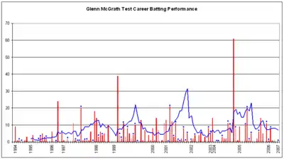 McGrath's batting prowess, in the early phases of his career, was poor; in fact, he scored first-ball ducks (zero runs) on both his Test[33] and One-Day International[34] debuts, and his batting average hovered below 4 for the first few years of his career. Years of patient tutelage from captain and friend Steve Waugh improved this aspect of his game to the point where he scored a Test half-century, which came on 20 November 2004 against New Zealand Full Scorecard of Australia vs New Zealand 1st Test 2004 - Score Report | ESPNcricinfo.com at the Gabba. His final score in that innings was 61, sharing a last wicket stand of 114 with Jason Gillespie (54*) to hilarity and the acclaim of their team-mates.[32] Nevertheless, McGrath was, for the duration of his career, regarded as a batting 'bunny', although he pushed his average above 7.00 runs/dismissal by the end of his career. In the first World Cricket Tsunami Appeal charity match, he was promoted to bat at number 6 ahead of specialist batsmen Stephen Fleming and Matthew Hayden, but was dismissed first ball trying to slog Muttiah Muralitharan. Towards the end of his international career McGrath, while not scoring many runs himself, became rather more difficult for opposing bowlers to dismiss, being dismissed only once during the 2005 Ashes series. With a contribution of 11 runs in the first innings of the MCG 2005 Boxing Day Test versus South Africa Full Scorecard of Australia vs South Africa 2nd Test 2005 - Score Report | ESPNcricinfo.com, he stood his ground for 53 deliveries, helping Michael Hussey push the Australian tail to a record tenth-wicket stand against South Africa of 107 runs.