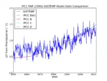 2 emissions compared to five of the IPCC's "SRES" emissions scenarios. The dips are related to global recessions. Image source: Skeptical Science.