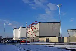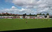 The Mazuma Stadium (formerly known as the Globe Arena for sponsorship reasons) is a football stadium in Morecambe, Lancashire, England, which is used by Morecambe F.C.[1][2][3][4][5] The stadium holds up to 6,476 supporters, with 2,173 seats available in the Main Stand, which runs the length of one side of the pitch. Opposite the Main Stand is an uncovered terrace with a capacity of 606, giving a similar feel to the ground as that at Christie Park. At either ends of the pitch are the home and away stands, with the home end holding a maximum of 2,234 supporters and the away end having a capacity of 1,389.[6] In the north east corner of the stadium is the Tyson Fury Foundation, which is split between two floors. The building also houses a gym, and was purchased by Tyson Fury in August 2020. The stadium replaced the old Morecambe F.C. stadium, Christie Park, which was Morecambe's home since 1921.