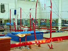 Various gymnastics apparatuses. Apparatuses shown include the horizontal (high) bar, the uneven bars, and still rings.