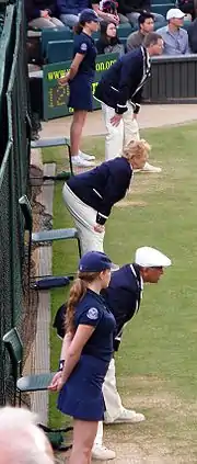 - Ball boy (also ball girl or ballkid): a person, commonly a child tasked with retrieving tennis balls from the court that have gone out of play and supplying the balls to the players before their service. Ball boys in net positions normally kneel near the net and run across the court to collect the ball, while ball boys in the back positions stand in the back along the perimeter of the arena. Ball boys in the back are responsible for giving the balls to the player serving.[19]