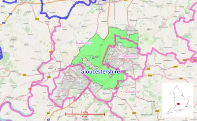 Land area taken up by the green belt is 6,694 hectares (66.94 km2; 25.85 sq mi), 0.05% of the total land area of England (2010).[2] It is mainly within Tewkesbury district,[3] with small portions within the fringes of the Cheltenham[3] and Cotswold[4] districts. Innsworth is the largest community within the green belt.
