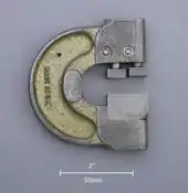 Snap gauges are often used when a large quantity of work pieces must be inspected.[4] The snap gauge has four anvils or jaws, the first one or pair (outermost) are set using the upper limit (tolerance) of the part and the inner set adjusted to the lower limit of the part. A correctly machined part will pass the first set of jaws and stop at the second—end of test. In this manner, a part may be checked in one action, unlike the plug gauge that needs to be used twice and flipped to access the second gauge. The first go/no-go snap gage for checking thread rolls was invented in 1943 to speed production of parts during WWII.[5]
