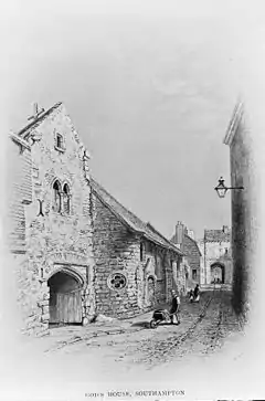 The Hospice, or Hospital of God's House – Domus Dei or Maison Dieu – was founded in the latter half of the 12th century by Gervase (or Gervaise) le Riche, burgess and portreeve (port warden) of Southampton.[3] In the Norman or Mediaeval Latin of that period, he is named Praepositus de Sudhanton. Gervase le Riche had one brother, Roger (possibly a twin), who was the first warden of God's House.[4] The reasons for le Riche's decision to found the hospital are not known. John Leland reported that the hospital was founded on the site of the founder's home. As port warden, le Riche would be likely to live near the port; his house would have opened directly onto the harbour, at a time when there was no wall running along Winkle Street from the Water Gate to God's House Gateway. He would step out of his house, through the wicket-gate, at once upon a pier or quay, against which the waters lapped at high tide, and where the official vessel awaited him for embarkation. Behind, and at the side of his house, along the present High Street, and up to Gloucester Square, stretched the garden and orchards. Nearby, at the other side, lay the Bowling Green.[5]