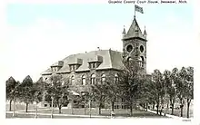 Gogebic County was organized in 1887, partitioned from Ontonagon County. The county's name derives from a lake of the same name, which was originally rendered Agogebic. Sources agree that the name is from Ojibwe, but differ on the original meaning. The county's website suggests it meant "body of water hanging on high,"[4] but an 1884 military annal said it meant "water-mold lake" (Agogibing).[5] (See also: List of place names of Native American origin in Michigan)