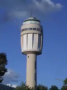 The Goldbergturm is a 51 metre high water tower on the Goldberg (gold mountain) at 48°42′06″N 9°01′03″E in Sindelfingen, Germany. The Goldbergturm was built in 1963 and has in its basket, besides a water reservoir, a restaurant from which a stairway runs to its open-air observation deck.