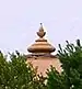 Each dome is topped with a kalasha. These rooftop sculptures are 7.5 ft (2.9 m) tall and 5 ft (1.5 m) wide and were cast in acrylic resin by a university professor in 1997.[27] Surrounding areas and berms were also flattened[28][29] and auspicious fencing was added around each dome in 1999.[30] Later some aspects of the building were deemed inauspicious[31] and western entrances were replaced with east facing entrances for one of the domes in 2001.[32][33] An expanded vestibule on the east side includes a large room for coats and shoes and the performance of Yoga positions or asanas.[34] The eastern end of one dome was squared-off, to align it with the philosophy of Maharishi Sthapatya Veda (MSV) architecture.[32][35][36] The entry to the second dome was moved in 2005 and bathrooms were added, replacing a temporary trailer which had been used for the purpose.[37][30] In accordance with the MSV architectural philosophy the domes were topped by cupolas called kalashes.[38] In 2008 the roof of the Maharishi Patanjali dome was resurfaced and repainted.[39]