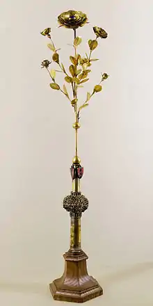 The value of the rose varies according to the munificence of the pontiffs or the economic circumstances of the times. Baldassari (1709) says that the rose conferred about the year 1650 cost about 500 écus (scudi d'oro; 500 écus are the equivalent of about 1.7 kg of gold). The two roses sent by Pope Alexander VII were valued at about 800 and 1200 écus respectively. Pope Clement IX sent the Queen of France one costing about 1600 écus, made of eight pounds of gold. The workmanship on this rose was exceedingly fine, for which the artificer received the equivalent of 300 écus. Innocent XI caused seven and one-half pounds of gold to be formed into a rose, which was further embellished with many sapphires, costing in all 1450 écus.[2] Rock (1909) adds that in the 19th century not a few of the roses cost 2000 écus and more.[3]