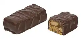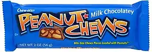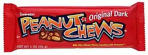 Peanut Chews are a family of a U.S. candy bar products manufactured by Just Born. They consist of peanuts and molasses covered in chocolatey coating, and are available in original dark chocolatey flavor and milk chocolatey coatings. The bars are small, similar in size to a "fun size" or Halloween-size bar. They are especially familiar to residents of the Philadelphia area and neighboring Mid-Atlantic states.