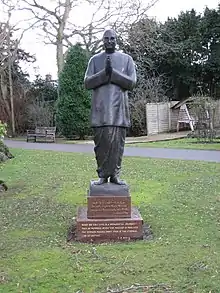 The crematorium gardens are listed at Grade I in the National Register of Historic Parks and Gardens.[2] The Philipson Family mausoleum, designed by Edwin Lutyens, is a Grade II* listed building on the National Heritage List for England[10] and the crematorium building,[6] the wall, along with memorials and gates,[11] the Martin Smith Mausoleum[12] and Into The Silent Land, a sculpture by Henry Alfred Pegram[13] are all Grade II listed buildings. The largest sculpture portraying someone cremated here is the statue of Indian industrialist and friend of Gandhi, Ghanshyam Das Birla.