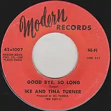 "Good Bye, So Long" was released as a single on Modern Records in May 1965. It reached No. 31 on Billboard's R&B Singles chart and No. 108 on Bubbling Under The Hot 100.[3][4] Tina Turner promoted the record on Shindig! in August 1965.[5] The B-side "Hurt Is All You Gave Me" received a 4 star rating from Billboard.[1] Both songs appeared on the compilation album The Soul of Ike & Tina, released on Kent Record in 1966. After the success of "River Deep – Mountain High" overseas, Stateside Records licensed the record and released it as a single in the UK.[6]