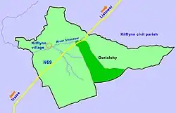 It is one of sixteen ancient townlands of the civil parish of Kilflynn and lies centrally in the parish. It touches the River Shannow by the Waterfall, and the northern tip is just clipped by the N69 Tralee-Listowel road. It is largely rural and partly forested.[1]