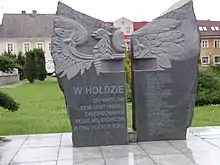 During the German invasion of Poland, which started World War II, Gostyń was captured by the Wehrmacht on September 6, 1939.[6] During the Nazi German occupation of Poland Gostyń became the site of public executions, arrests and expulsions of Poles. First mass arrests and executions were carried out already in September 1939.[7] On 21 October 1939 some 30 citizens of the town whose names were listed in the Sonderfahndungsbuch Polen (Special Prosecution Book-Poland) prepared by local German minority, were executed by an Einsatzkommando. Among the murdered were Gostyń's mayor Hipolit Niestrawski, Polish activists, officials, craftsmen and former Greater Poland insurgents.[8] Mass expulsions began on 4 December 1939, with up to 2,000 Poles deported to General Government on the orders of SS-Standartenführer Ernst Damzog stationing in Poznań. Between spring of 1940 and 15 March 1941 additional 3,222 were deported.[9] Władysław Nawrocki, Polish officer and pre-war chairman of the local football club Kania Gostyń, was murdered by the Soviets in the Katyn massacre in 1940.[10] In 1940 the Czarny Legion secret Polish resistance organization was founded.[6] It was crushed by the Germans in 1941. Several dozens of its members were arrested and then brutally tortured in a prison in Rawicz.[6] After a Nazi show trial in Zwickau in 1942, 12 members were executed in Dresden, and several dozen were imprisoned in Nazi concentration camps, where 37 of them died.[6] German occupation ended in 1945.