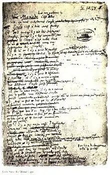 Leibniz dated his beginning as a philosopher to his Discourse on Metaphysics, which he composed in 1686 as a commentary on a running dispute between Nicolas Malebranche and Antoine Arnauld. This led to an extensive and valuable correspondence with Arnauld;[56] it and the Discourse were not published until the 19th century. In 1695, Leibniz made his public entrée into European philosophy with a journal article titled "New System of the Nature and Communication of Substances".[57] Between 1695 and 1705, he composed his New Essays on Human Understanding, a lengthy commentary on John Locke's 1690 An Essay Concerning Human Understanding, but upon learning of Locke's 1704 death, lost the desire to publish it, so that the New Essays were not published until 1765. The Monadologie, composed in 1714 and published posthumously, consists of 90 aphorisms.