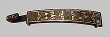 The Minister of the Guards (Weiwei 衛尉) was also known as Commandant of the Guards), and briefly as the Prefect of the Palace Grandees (Zhong da fuling 中大夫令) during Emperor Jing of Han's reign (r. 157–141 BC) before reverting to the original title. This Minister was responsible for securing and patrolling the walls, towers, and gates of the imperial palaces.[82] The duties of his ministry were carried out by prefects, one of whom controlled the gates where nominees for office were received and officials sent memorials to the throne.[83] To control and monitor the flow of traffic through the palace gates, the prefects used a complex passport system involving wooden and metal tallies. During an emergency, the tallies were collected and no-one was allowed to enter unless they breached the gates by force.[84] The guards were conscripted peasants who served for a year's term as soldiers and were invited to attend a celebratory feast hosted by the emperor before demobilization.[85]