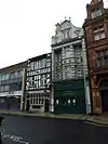 This ornate, Flemish style building is situated between the Red Lion inn and the former head Post Office. The building is four storeys high, with the roof concealed by an elaborate curved pediment over a wide bracketed cornice. On the second and first floors there is a three light canted bay. The shop-front is modern. The facade is heavily decorated with circlets of various fruits, including pineapples, bananas and grapes, reflecting its original use as offices for a firm of fruit importers.[45] The property is occupied by a Balti House takeaway. | ||