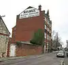 This Art Nouveau style warehouse, also known as 88 & 90 French Street, was designed by Francis William Wade[16] and, since 1983, has been used by the City Council to house its archaeological collection.[17] The building is four storeys high, with a basement, and is built of red brick with stone dressings. Above the central window on the top floor is a crow-stepped parapet surmounted by an eagle. The three third floor windows are flanked by stone columns. The second floor windows have three lights and cambered heads. They are separated from the windows on the first floor by a panel decorated with Art Nouveau flowers and heart emblems, the numbers 19 and 03, and the letters M and W.[18] The ground floor windows have cambered arches, with a pedimented doorcase inserted into the central window and a carriage entrance on the left with curbing stones. On the southern elevation of the building is painted "May & Wade, Export Grocers, Shipping Contractors".[18] | ||