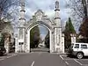 Opposite Southampton General Hospital in Tremona Road, the gates to Hollybrook Cemetery are built of coursed rubble with ashlar dressings. The arched vehicle entrance has dripmoulding ending in corbels with a stepped parapet above bearing the Southampton Civic Shield. The two flanking piers are in three stages, the lowest square and the upper two octagonal, and are surmounted by statues of angels. On each side are pedestrian entrances flanked by square piers with gabled caps. | ||