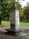 This was the first public drinking fountain installed in Southampton. It was erected at the instigation of the local Unitarian Church minister, Edmund Kell, and funded by a wealthy benefactor, Charles Melly from Liverpool.[59] Kell provided the fountain in an attempt to curb "the town's drunkenness and disorder" by providing an alternative source of refreshment other than alcohol.[59] Originally installed at the corner of Marsh Lane, East Street and St Mary Street, the fountain was disconnected from the water supply in 1939 and relocated in 1959 to make way for road improvements. The fountain comprises a tapering square pillar of rusticated ashlar with pediments on all four sides, surmounted by a ball finial. There are stone seats at the base on all four sides and two small iron lions' head masks on one face. | ||