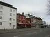 This public house on Oxford Street is situated close to Southampton Docks and was popular with both dockworkers and crew.[35] It was here that the three Slade brothers had been drinking in April 1912 when they missed the departure of the ill-fated Titanic, their route to the ship having been blocked by a train.[36][37] The pub is now owned by Coastal Inns & Taverns.[38] It is a three storey yellow brick building with an attic floor above the parapet. At each floor there are three windows, with the centre ones being blank. On the centre of the first floor, there is an ornamental wrought iron overthrow bearing the name of the public house, behind which is a picture of the Titanic. The ground floor bar frontage with three doors is late-19th-century. | |||