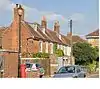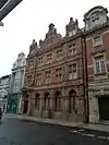 The town’s former Post Office at 57 High Street was opened on 5 November 1892 to replace an earlier office which had been occupied since 1861.[20][21] The new building was built in the Flemish style of red brick with terracotta dressings. It is three storeys high surmounted by three elaborate pediments. Below the pediments is a modillion cornice with a frieze. The building has five mullioned and transomed casement windows on the second and first floors. On the ground floor, there are four round-headed windows with a projecting pedimented porch supported on console brackets to the left. In the pediment, there is a moulded crown. Beneath the building is a 14th-century vault, which is a Scheduled Ancient Monument.[22] The upper floors have been converted into apartments.[23] Planning permission has been granted to convert the ground floor into a restaurant.[24] | ||