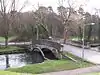 There has been a bridge over the River Itchen at this location since at least the year 932, when it was referred to as Mannysbrigge in King Athelstan's charter to the prior of St. Swithun's Priory in Winchester.[5] The present bridge was built in 1816 by Hampshire County Council; this bridge was made of stone with a single segmental arch and decorated with a lambswool pattern. | ||