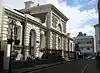 The former County Court in Castle Lane was built in a "solid Italianate style" unlike the more restrained Lansdowne House opposite. Described as "rather overpowering in the narrow street",[19] it comprises a large two-storeyed central section with two single storey wings, all built in yellow brick with rusticated stucco quoins and cornice. At the centre is a recessed arch with stucco voussoirs; in the arch is the Royal Coat of Arms. At the top of the ground floor level, there is a cornice which carries across the arch. The central doorway has a double keystone and stands on a flight of steps. The left wing has two windows and a rusticated arched doorcase while that on the right has a plainer doorcase and an arched central window. The door to the left has the words "Public Entrance" carved into a panel on the cornice. The sides of the central building have arched windows at first floor level with the ground floor being obscured by various later additions.[19] | ||