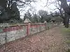 The wall on the western edge of the cemetery, fronting Hill Lane, runs for approximately 500 metres. It is described as "coursed rubble about 5 ft in height with red brick coping and piers at regular intervals" and was built by Arthur Few.[16][18] | ||