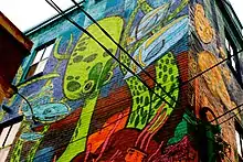 A public effort that legitimized the use of graffiti was established by the Queen Street West Business Improvement Association (BIA) for the area colloquially known as Graffiti Alley (originally Rush Lane).[16] Chair of the BIA, Spencer Sutherland, initiated this movement to protect property owners who did not wish to remove the graffiti street art and were being ticketed. The BIA claimed that the area was culturally significant, citing Rick Mercer's use of the laneway, between Queen Street and Richmond Street, from Spadina Avenue to Portland Street,[17] during his "Rick’s Rants" monologue on his CBC Television shows, notably The Rick Mercer Report,[18][19] and argued that it is a popular destination for photography and draws urban tourists to the area on a daily basis.