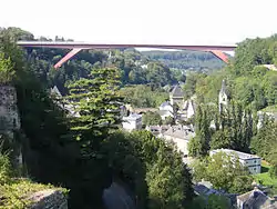 The Grand Duchess Charlotte Bridge (Luxembourgish: Groussherzogin-Charlotte-Bréck, French: Pont Grande-Duchesse Charlotte, German: Großherzogin-Charlotte-Brücke) is a road bridge in Luxembourg City, in southern Luxembourg. It carries the N51 across the Alzette, connecting Avenue John F. Kennedy, in Kirchberg, to Boulevard Robert Schuman, in Limpertsberg. The bridge is also known as the Red Bridge (Luxembourgish: Rout Bréck, German: Rote Brücke, French: Pont Rouge) on account of its distinctive red paintwork. It is the main route connecting the city centre, Ville Haute, to Kirchberg, the site of the city's European Union institutions.