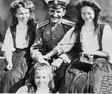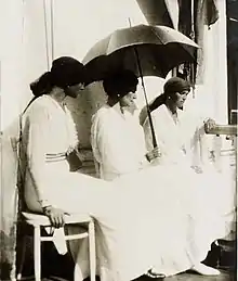 Olga was disdainful of her cousin Princess Irina of Russia's husband Felix Yussupov, the man who eventually murdered Rasputin in December 1916. Yussupov had taken advantage of a law permitting men who were only sons to avoid military service. He was in civilian dress at a time when many of the Romanov men and the wounded soldiers Olga cared for were fighting. "Felix is a 'downright civilian', dressed all in brown, walked to and fro about the room, searching in some bookcases with magazines and virtually doing nothing; an utterly unpleasant impression he makes – a man idling in such times", Olga wrote to her father, Tsar Nicholas, on 5 March 1915 after paying a visit to the Yussupovs.[83] She was also strongly patriotic. In July 1915, while discussing the wedding of an acquaintance with fellow nurses, Olga said she understood why the ancestry of the groom's German grandmother was being kept hidden. "Of course he has to conceal it", she burst out. "I quite understand him, she may perhaps be a real bloodthirsty German."[84] Olga's unthinking comments hurt her mother, who had been born in Germany, reported fellow nurse Valentina Ivanovna Chebotareva.[84] Nursing during the war provided Olga and her sister Tatiana with exposure to experiences they had not previously had. The girls enjoyed talking with fellow nurses at the hospital, women they would never have met if not for the war, and knew the names of their children and their family stories.[85] On one occasion, when a lady in waiting who usually picked up the girls from the hospital was detained and sent a carriage without an attendant, the two girls decided to go shopping in a store when they had a break. They ordered the carriage driver to stop in a shopping district and went into a store where they were not recognized because of their nursing uniforms. However, they discovered that they didn't know how to buy anything because they had never used money. The next day they asked Chebotareva how to go about purchasing an item from a store.[85] Yet other stories tell of a regular salary of nine dollars the girls received each month, and how they used it to purchase such items as perfume and notepaper.[86] They had also been shopping with their Aunt, Olga Alexandrovna[87] and Olga had visited shops on a trip to Germany with her sister Tatiana[88]