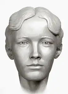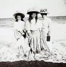 Olga had chestnut-blonde hair, bright blue eyes, a broad face, and an upturned nose. When she was 10, her tutor Pierre Gilliard reflected that she was "very fair" with "sparkling, mischievous eyes and a slightly retrousee nose."[2] Baroness Sophie Buxhoeveden, her mother's lady-in-waiting, reflected that "[she] was fair and tall, with smiling blue eyes, a somewhat short nose, which she called 'my humble snub,' and lovely teeth."[3] She was considered less pretty than her sisters Maria and Tatiana,[4] though her appearance improved as she grew older. "As a child she was plain, at fifteen she was beautiful", wrote her mother's friend Lili Dehn. "She was slightly above the medium height, with a fresh complexion, deep blue eyes, quantities of light chestnut hair, and pretty hands and feet."[5]
