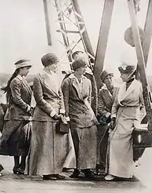 Before World War I, there was some discussion of a marriage between Olga and Prince Carol of Romania. In 1914, Foreign Minister Sergey Sazonov advocated the match because he wanted to ensure that the Romanian royal family would support Russia in case of a future conflict.[67] Nicholas and Alexandra saw the benefits of the match, but they insisted that “the grand duchess’s marriage … should take place only as the result of a much closer acquaintance between the young people and on the absolute condition of their daughter’s voluntary agreement to it."[68] In March 1914, Crown Prince Ferdinand of Romania, Crown Princess Marie of Romania, and Prince Carol of Romania visited the Romanovs in St. Petersburg. Despite going on walks and dinners with each other, Olga and Carol seemed uninterested in each other. During a visit to Romania in the spring of 1914, Olga and Carol were uninterested in each other and did not speak to each other.[69] Crown Princess Marie of Romania, noted that Carol was "not enamored of Olga's broad, plain face and brusque manner."[70] She judged that Olga's face "was too broad, her cheekbones too high,"[71] and she told her mother that all of the grand duchesses "were not found very pretty."[72] Marthe Bibesco, who was with the Romanian party, heard a rumor that the grand duchesses had "decided... to make themselves as ugly as they could.... so that Carol should not fall in love with any of them."[73] The plans were, in any event, put on hold upon the outbreak of war in 1914.